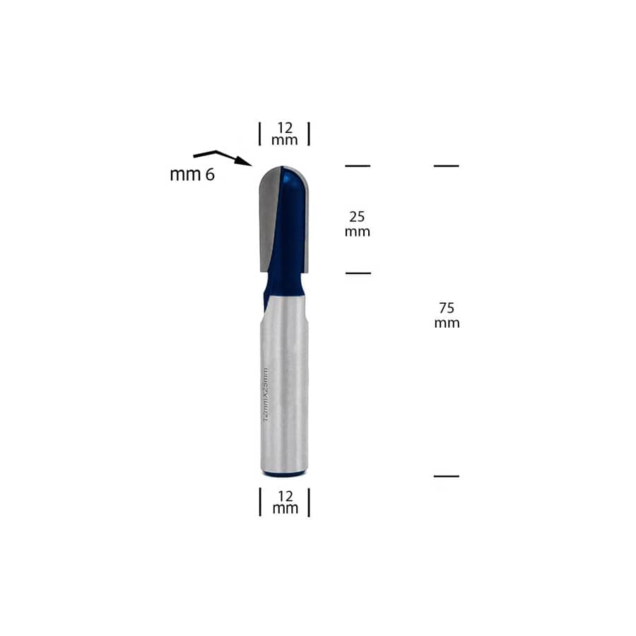 قطر 12 میلی‌متر، کارگیر 25 میلی‌متر، شعاع R6، شفت 12 میلی‌متر، ارتفاع کل 75 میلی‌متر – ابزاری دقیق برای حکاکی‌های سه‌بعدی و برش‌های منحنی در اورفرز و CNC روی چوب، MDF و پلاستیک